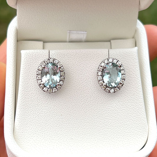 Aretes Aguamarina Natural Oval con Halo