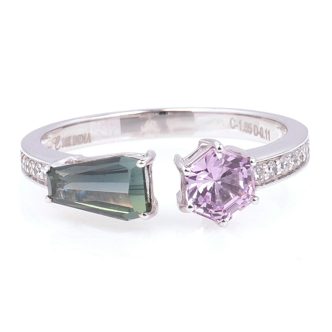 Disfruta de la belleza natural con nuestro anillo abierto con dos zafiros de color hermosos. Los zafiros se pueden encontrar en muchos colores, no solamente en azul. Este auténtico anillo es perfecto para un autoregalo especial. Con zafiros de colores naturales, ¡cada pieza es única! Sorprende a tus seres queridos con un regalo único y auténtico.