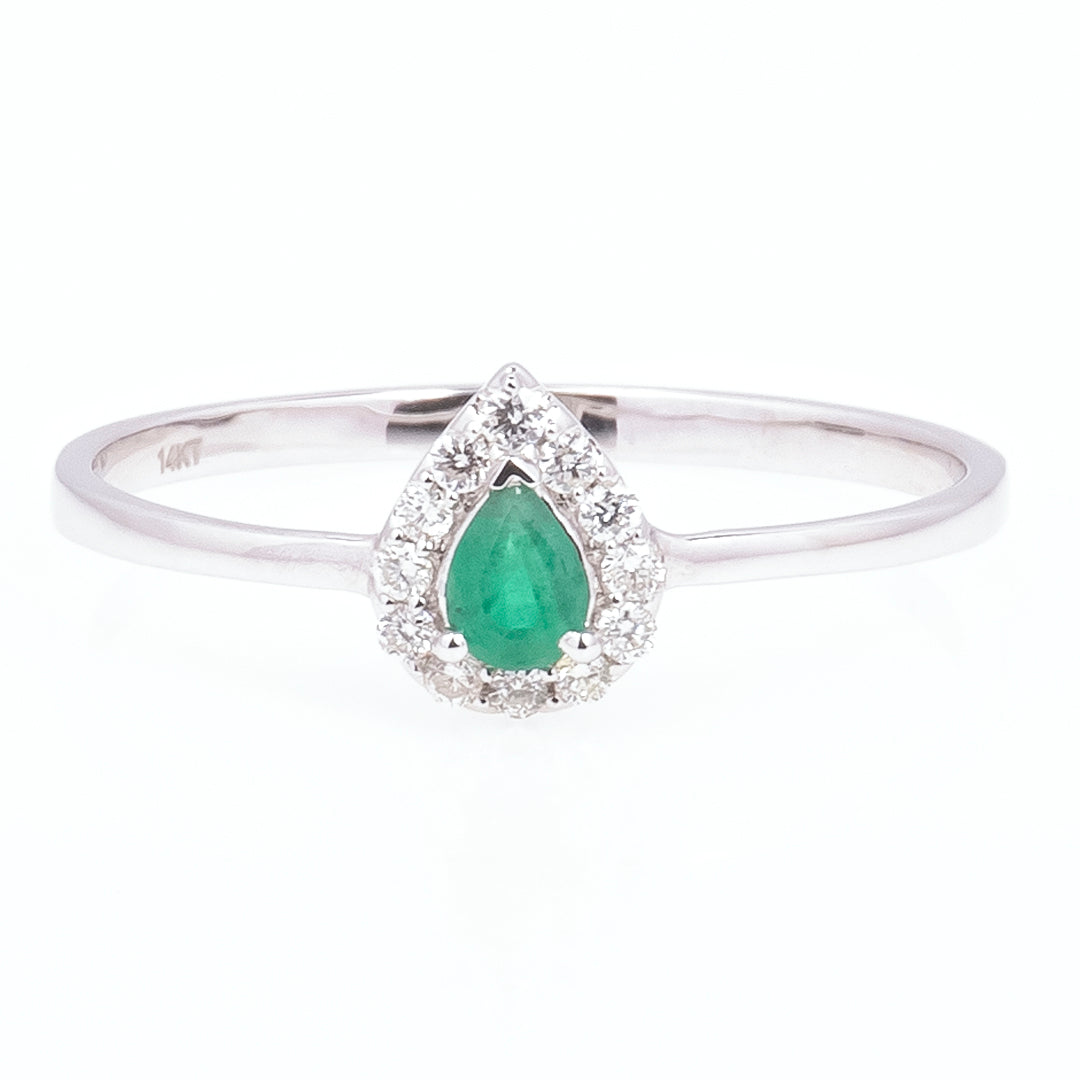 Este hermoso anillo es una verdadera joya de elegancia y distinción. Destacando en su centro una esmeralda de corte gota rodeada por diamantes naturales. Es una pieza que cautiva con su exquisita combinación de elementos.