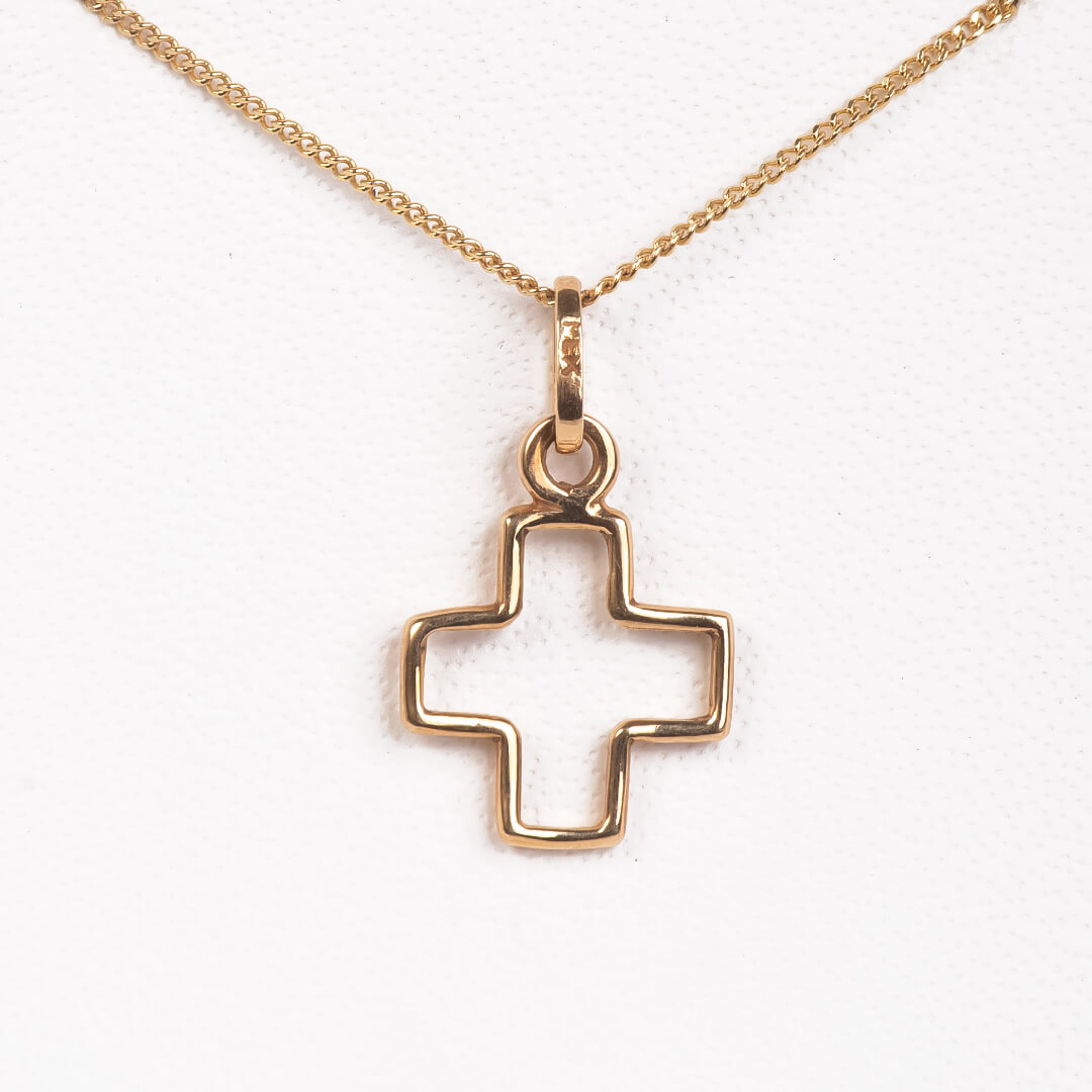 La Cruz Contorno 14k está elaborada en oro de 14 quilates, destacando por su diseño delicado y acabado impecable.