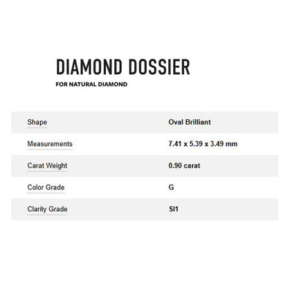 Adquirir un diamante natural es poseer una obra única de la naturaleza, formada durante millones de años bajo presión y perfección. Este corte oval de 0.90 quilates no solo refleja la luz con elegancia, sino también la exclusividad de lo auténtico. Porque lo verdaderamente valioso no se fabrica, se descubre.