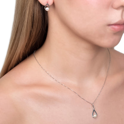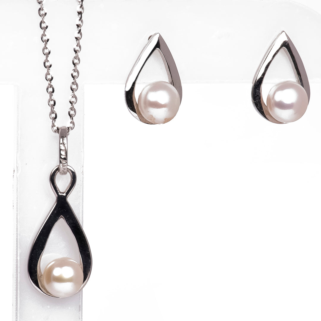 Hermoso Juego de aretes, dije y cadena diseño de una gota lisa calada con una perla. Perfecto para el diario.