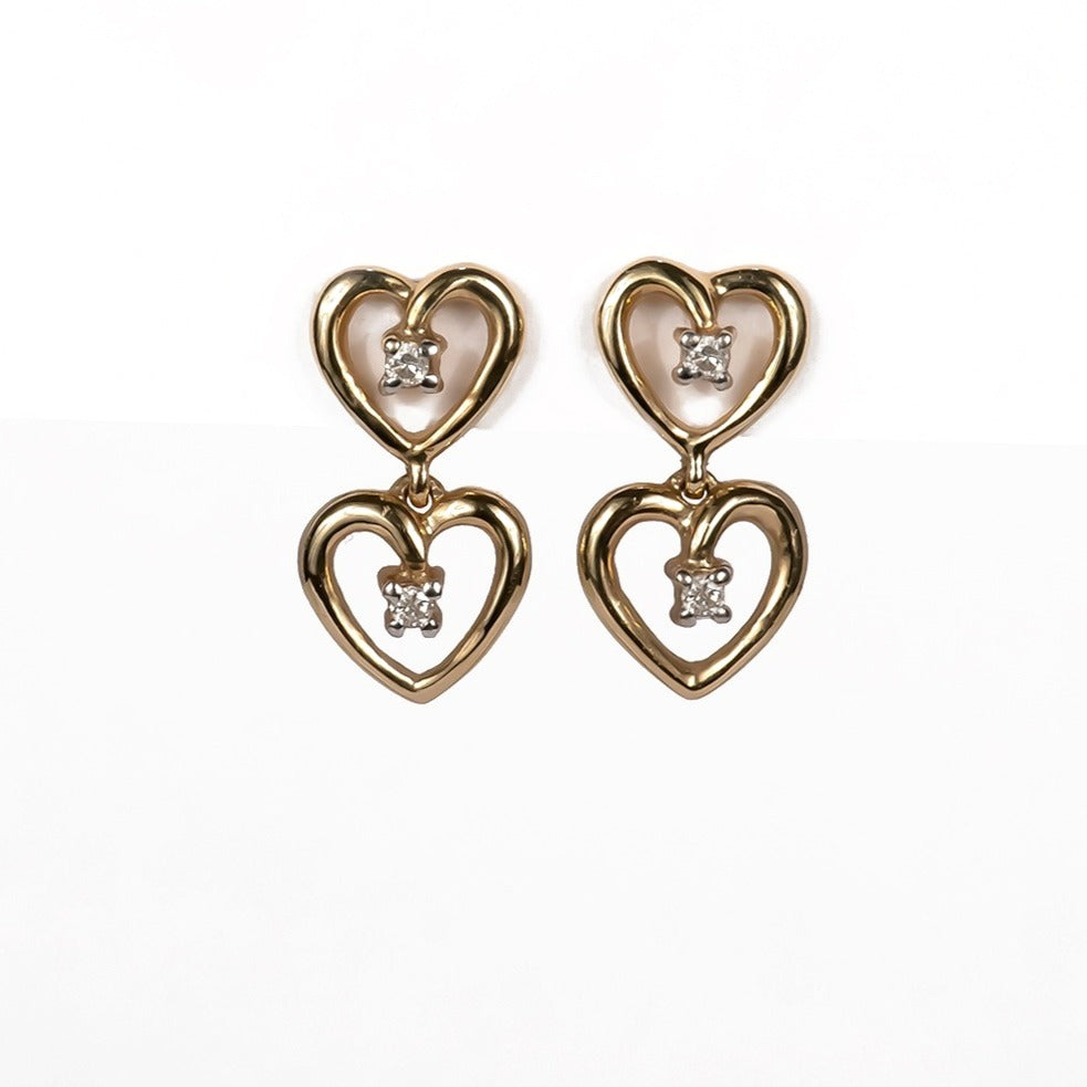 Arete hermoso diseño de dos corazones. Detalle de un diamante en el centro de cada corazón.
