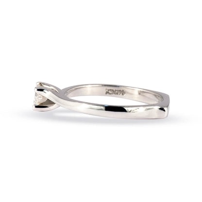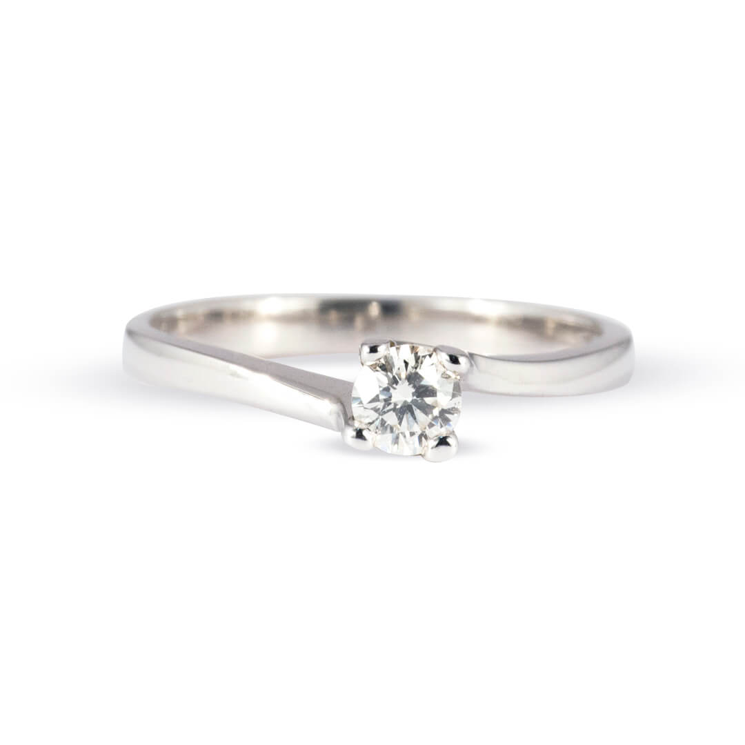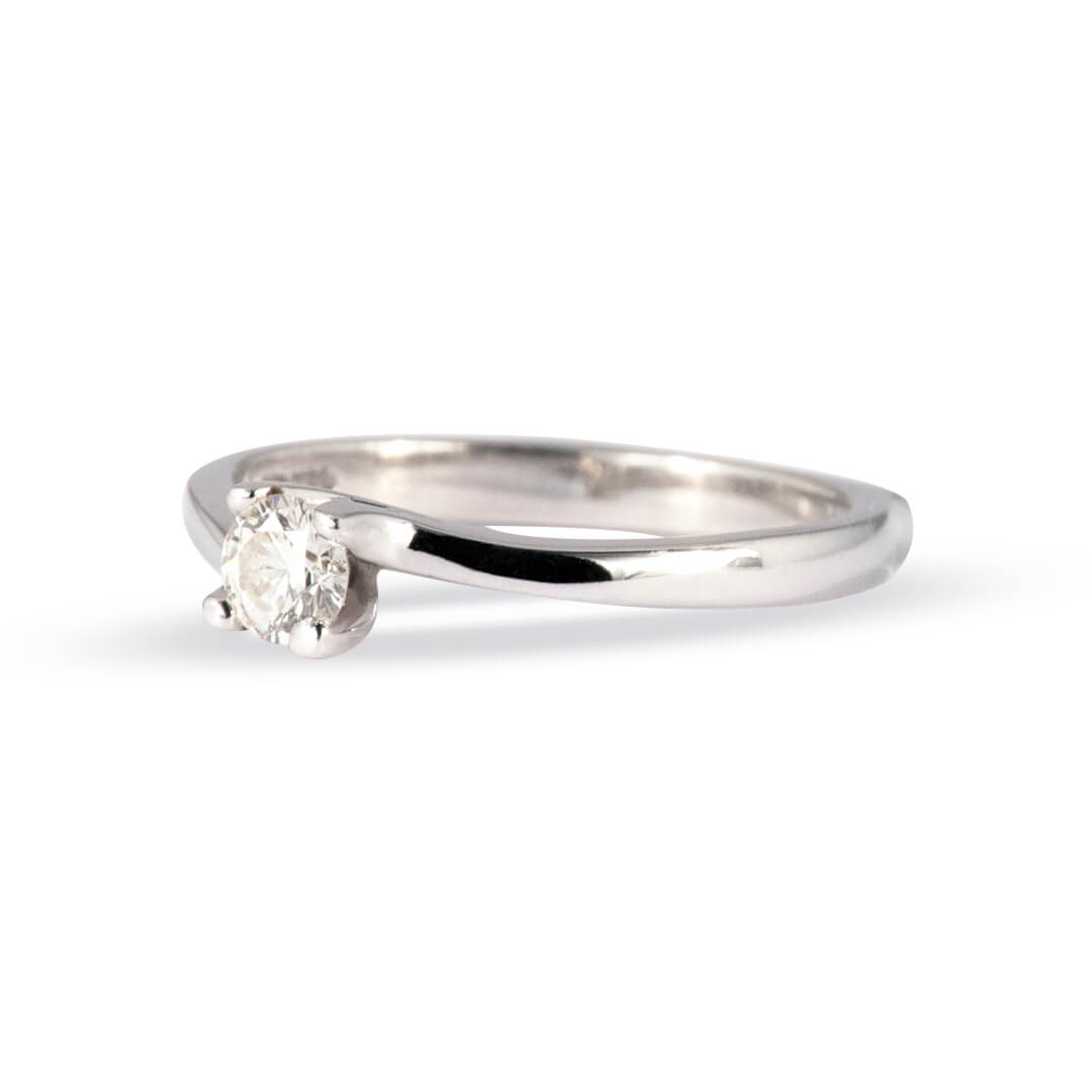Anillo tipo solitario. Diseño brazos encontrados que se conectan con las uñas donde esta montado el diamante.