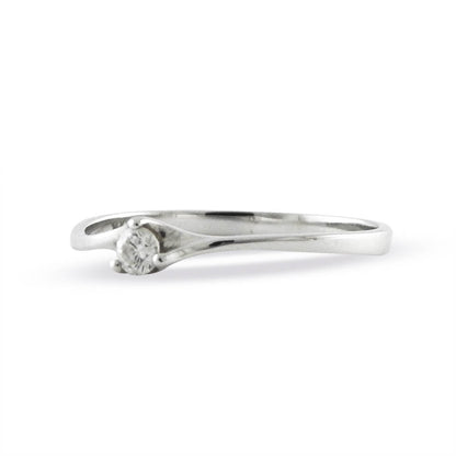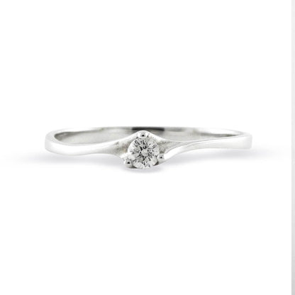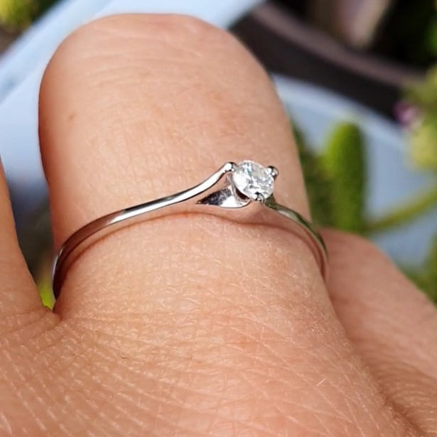 Anillo con diamante montado en 3 uñas. Diseño diferente, las uñas conectadas al brazo. El diseño es exquisito y el diamante está montado en bajito.