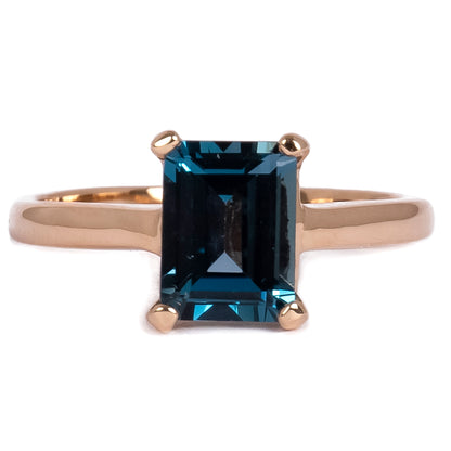 Bello topacio London Blue, en corte esmeralda montado tipo solitario en oro amarillo. Para el día a día luce espectacular.